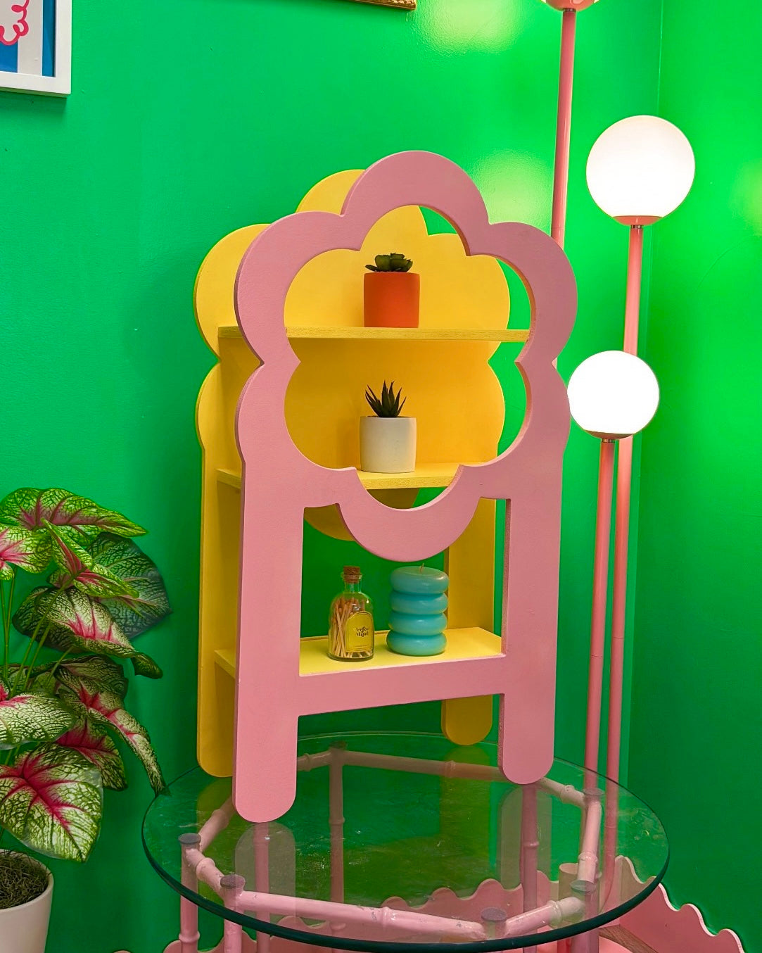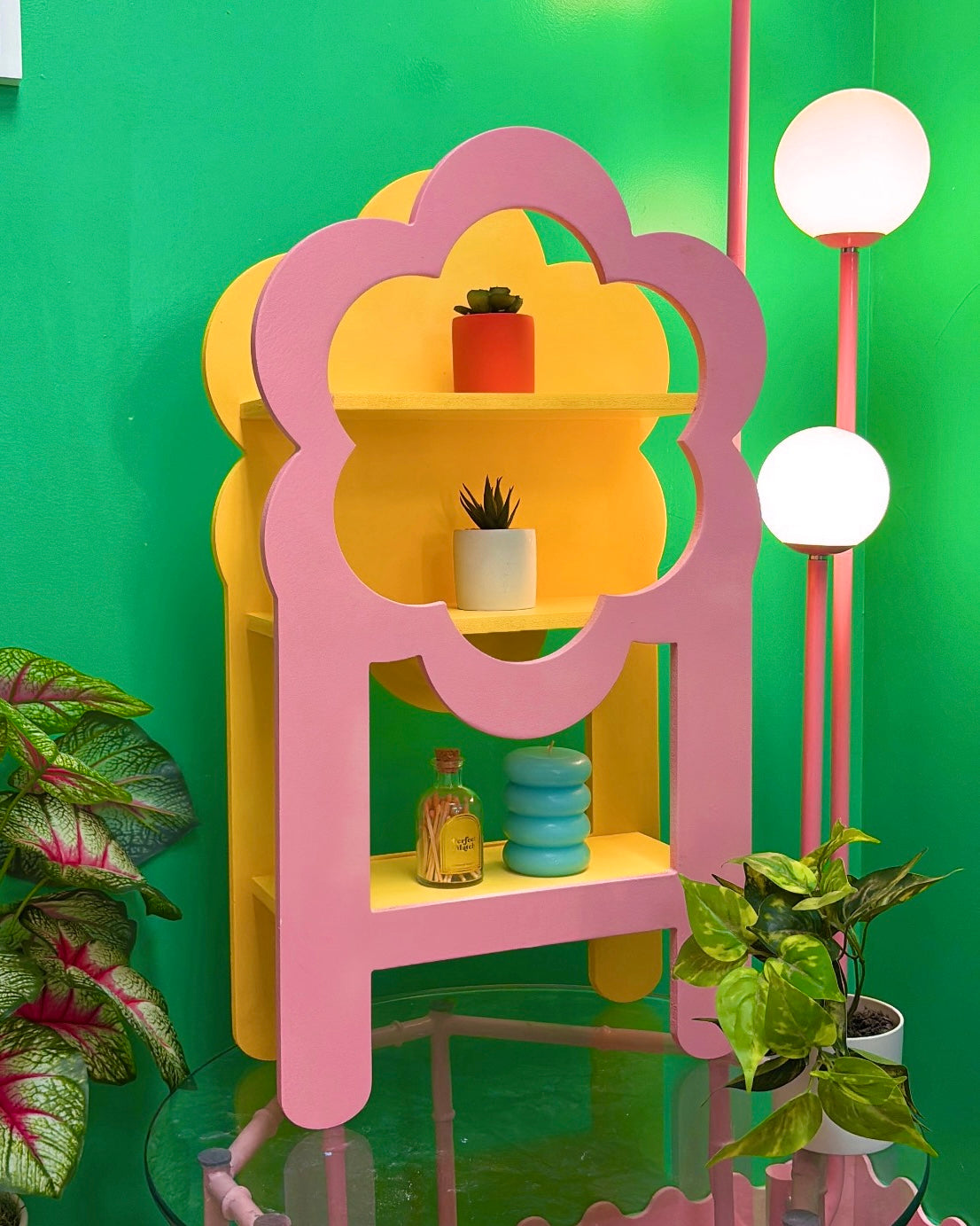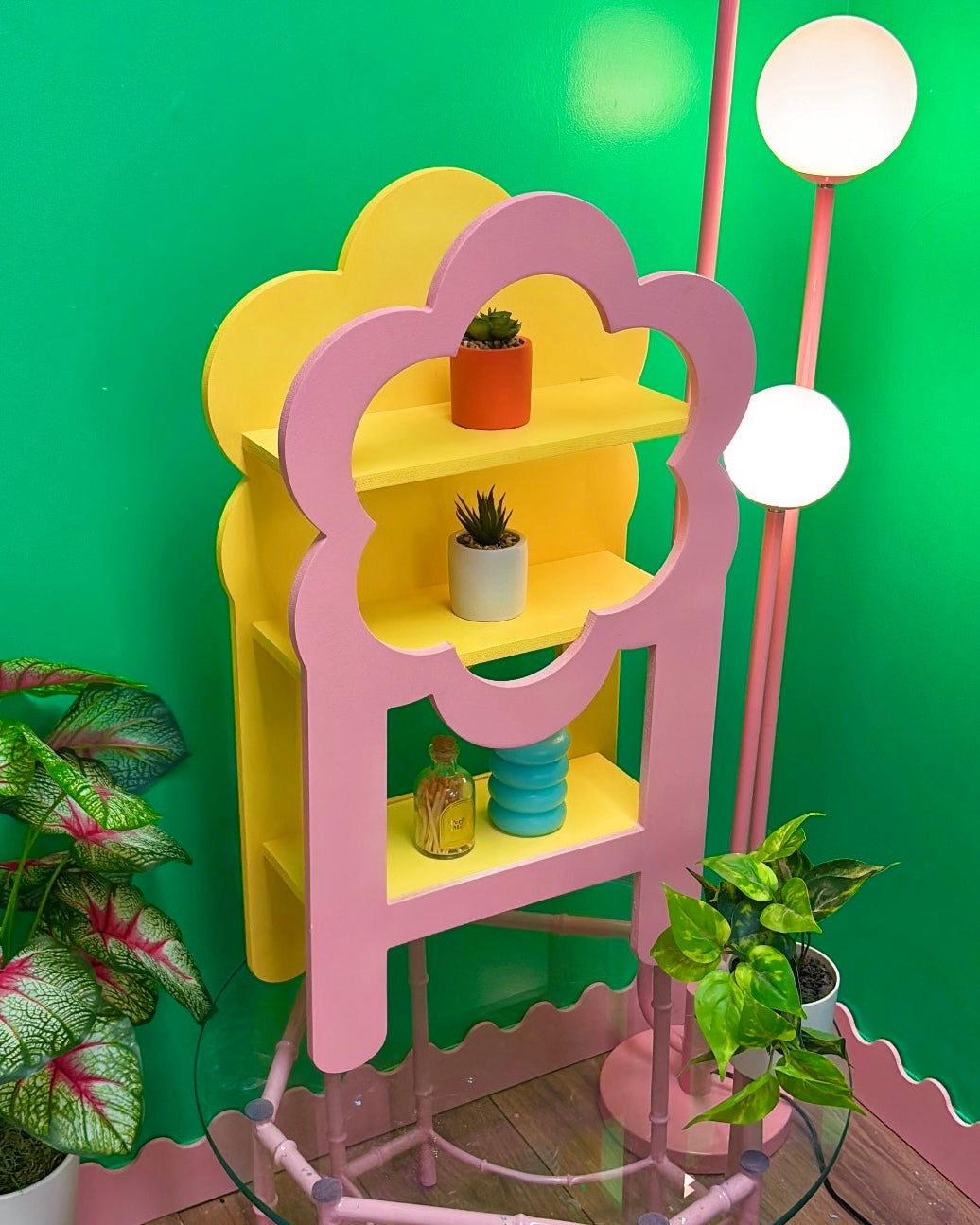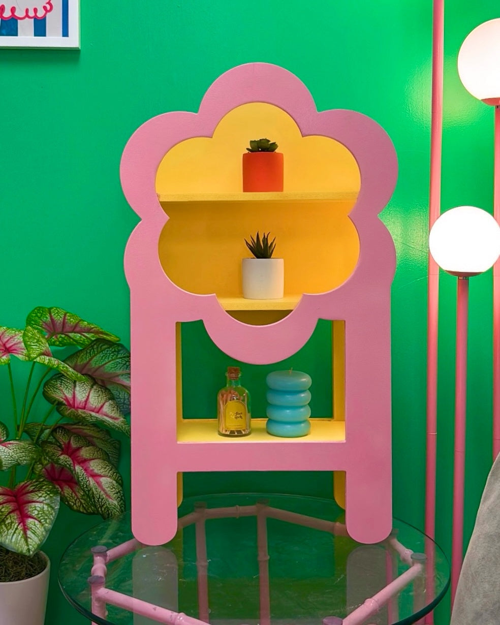 Create a blooming display with our Marigold Tabletop Display! Perfect for business owners and trinket lovers alike, this flower-shaped display features three shelves for all your treasures. A unique and playful addition to any space. (Flower power to the max!)