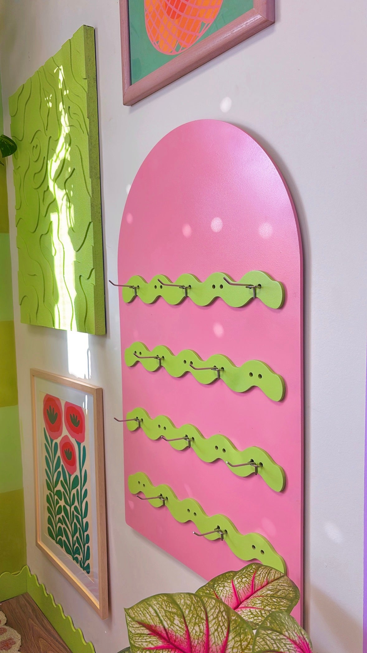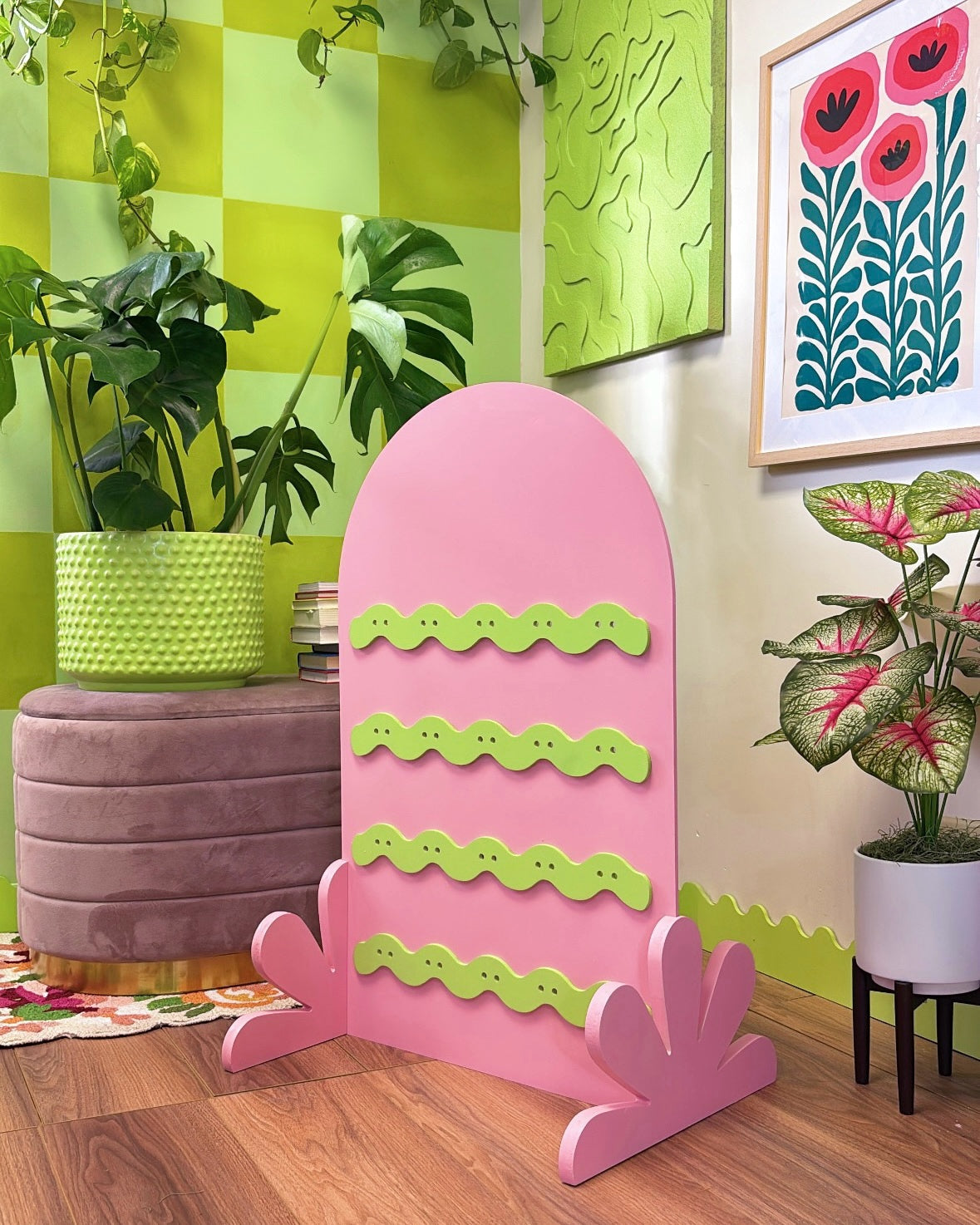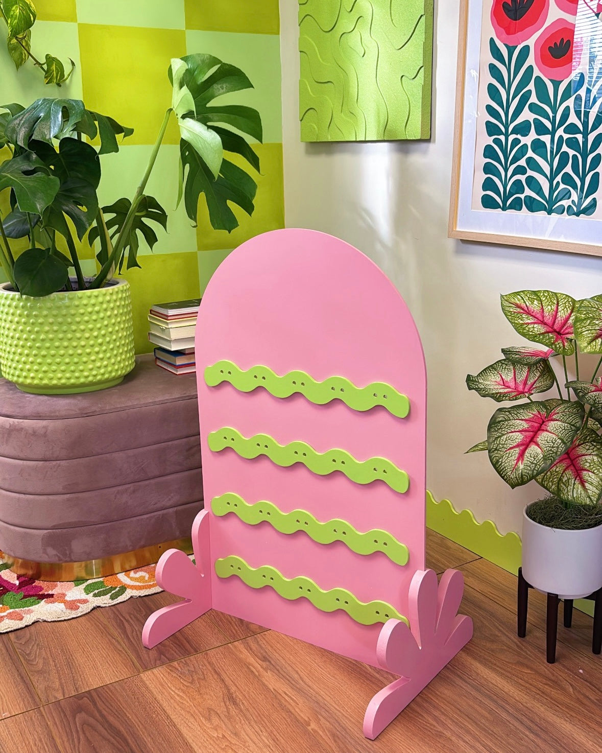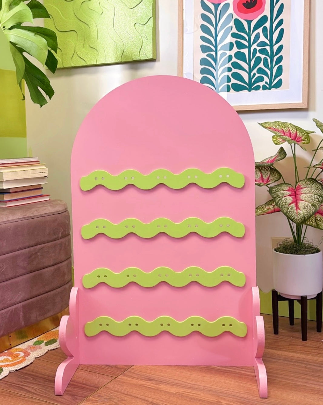 Get organized in style with the Meadow Pegboard! This unique pegboard features rows of quirky squiggles, perfect for holding all your essentials. Plus, the retro-inspired flower legs allow you to stand it up for a fun and funky display. Wall mounting is optional, but not necessary!