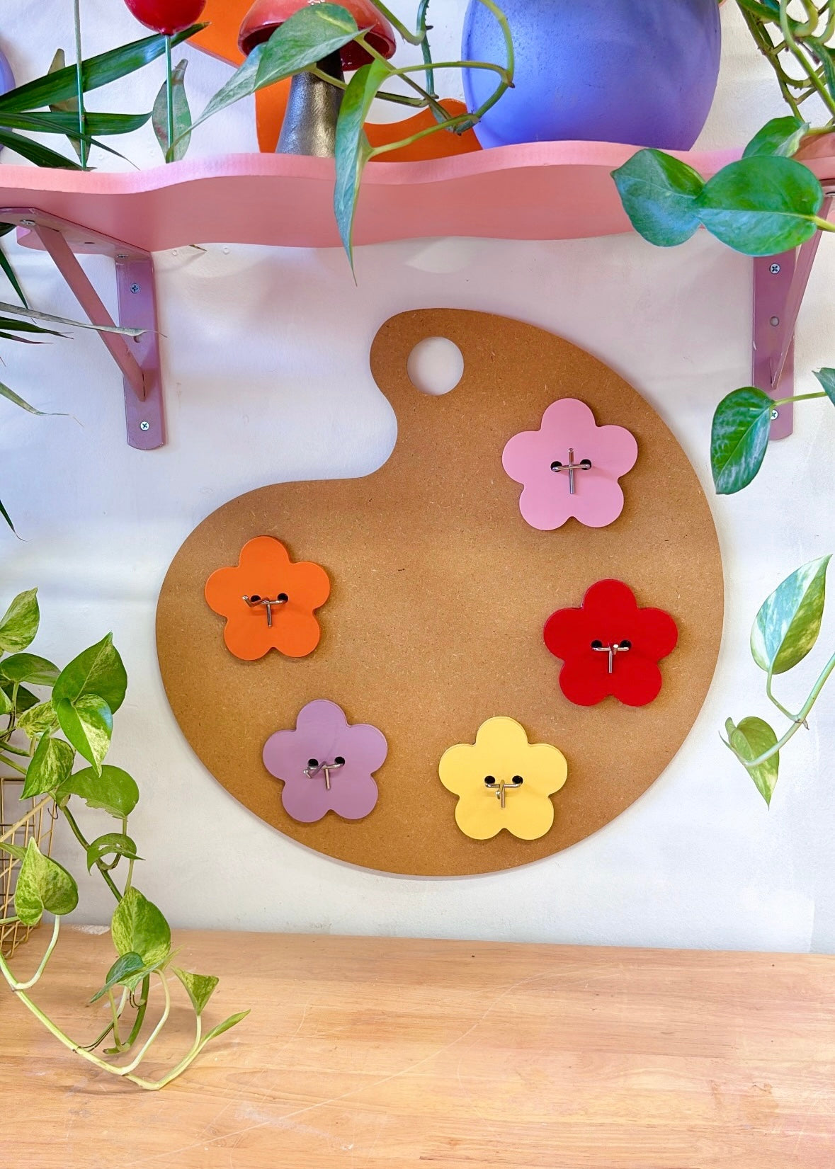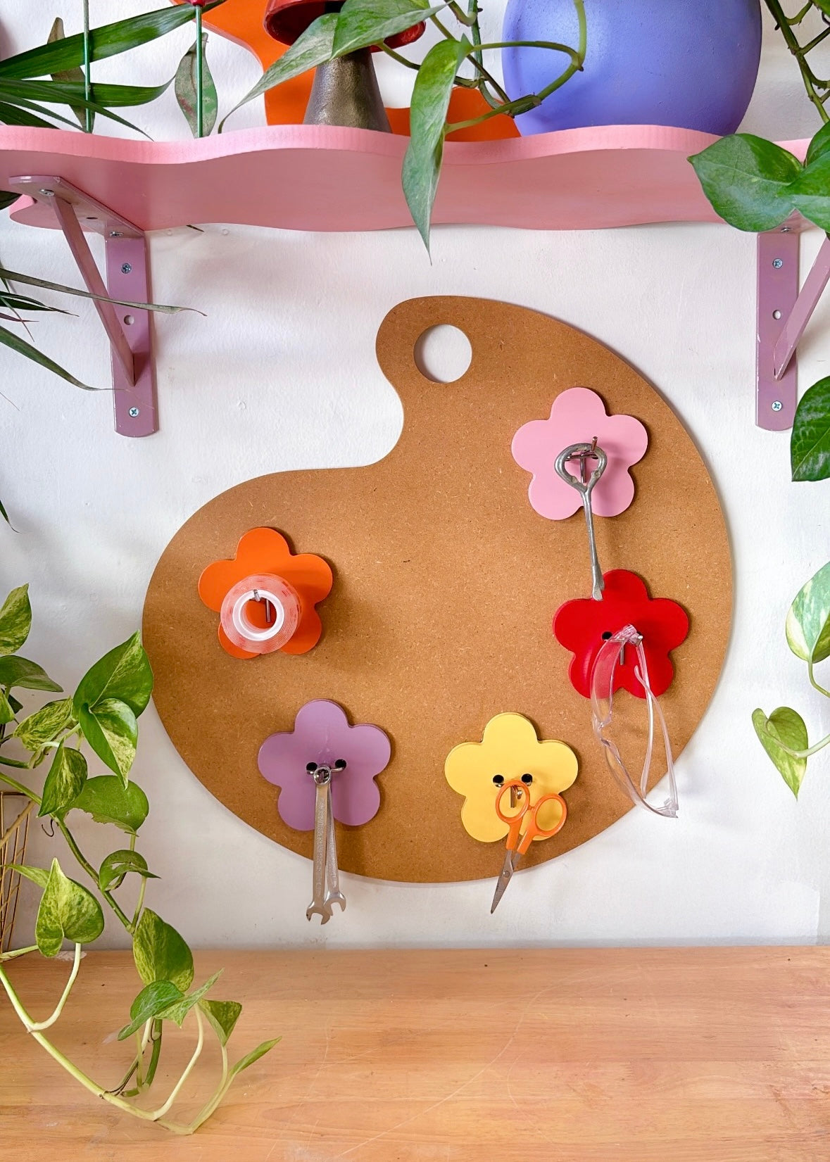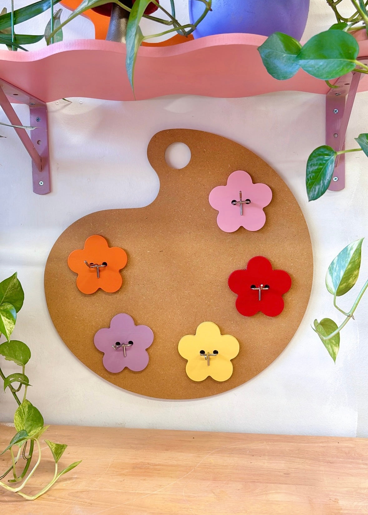A Curious way to stay organized and inspired while creating your next masterpiece 🎨 Unleash your inner artist with the Paint Palette Pegboard! This quirky pegboard is shaped like a paint palette and features daisy-shaped paint spots.