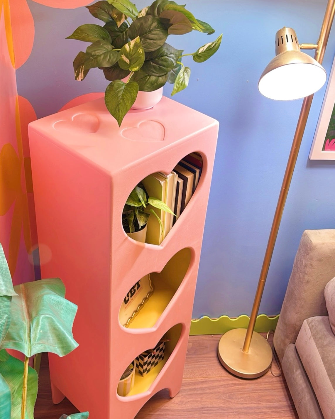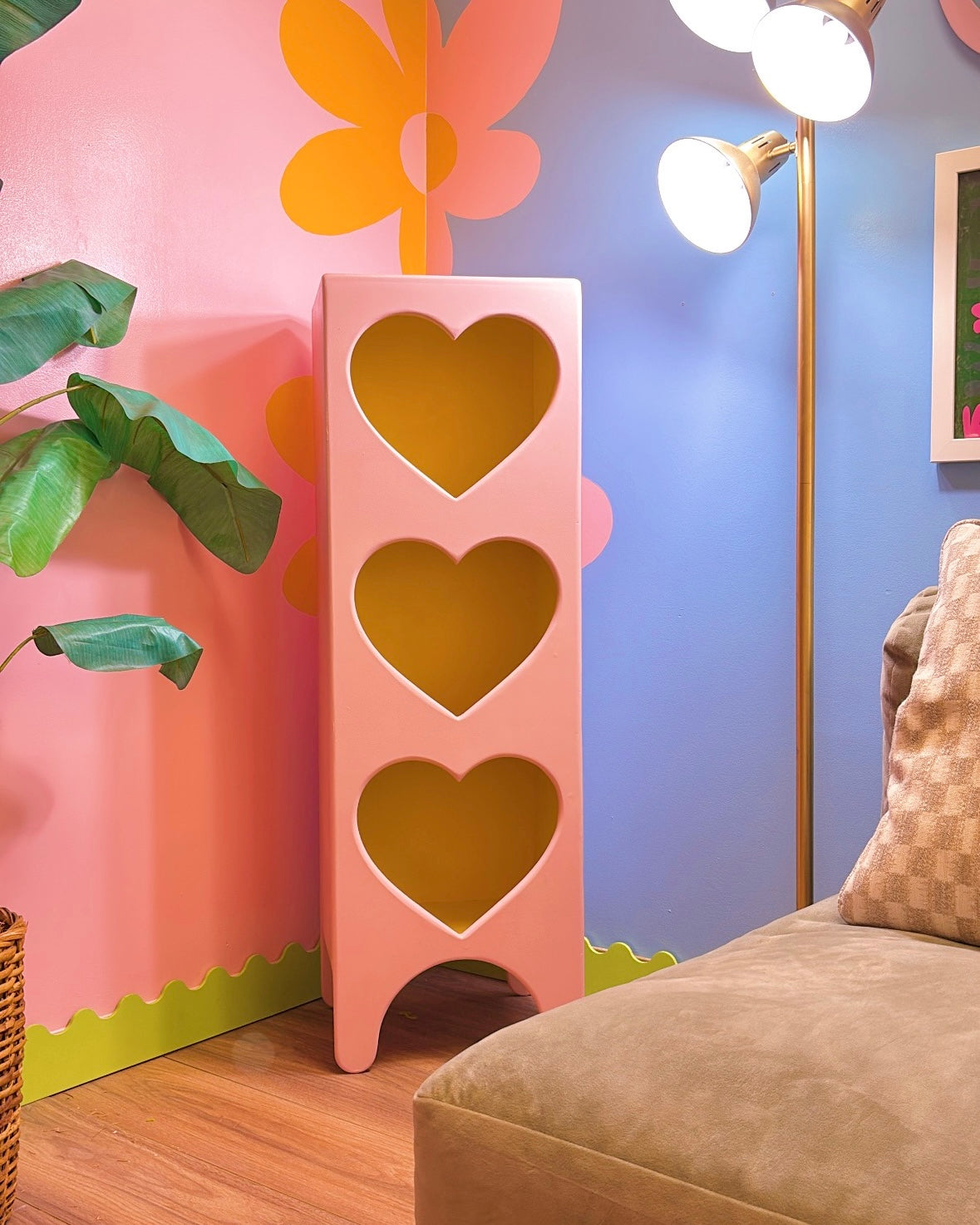 Meet the Sweetheart Tower! This tall cabinet features three adorable heart-shaped cubbies, perfect for showing off your plants, books, and treasures. With lovely heart engravings decorating the top and plenty of storage space inside, it's the perfect blend of fun and function.