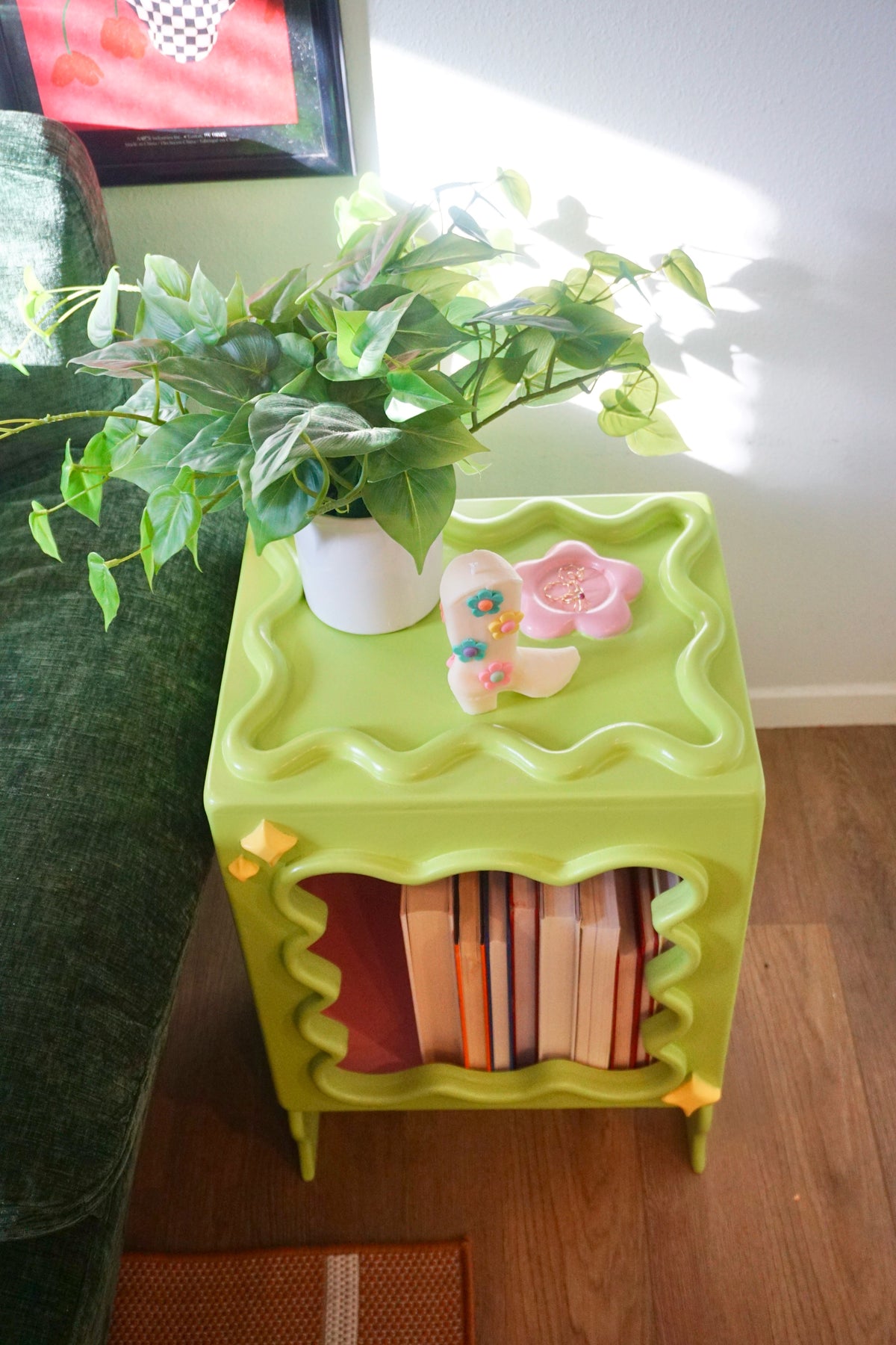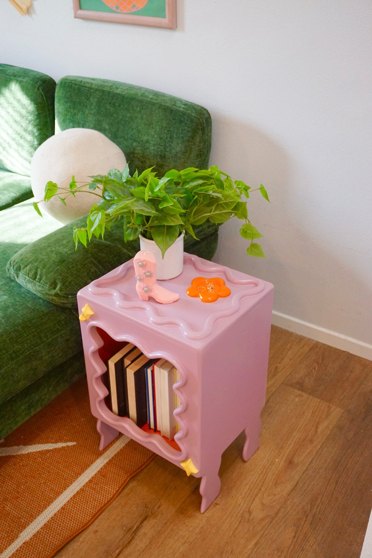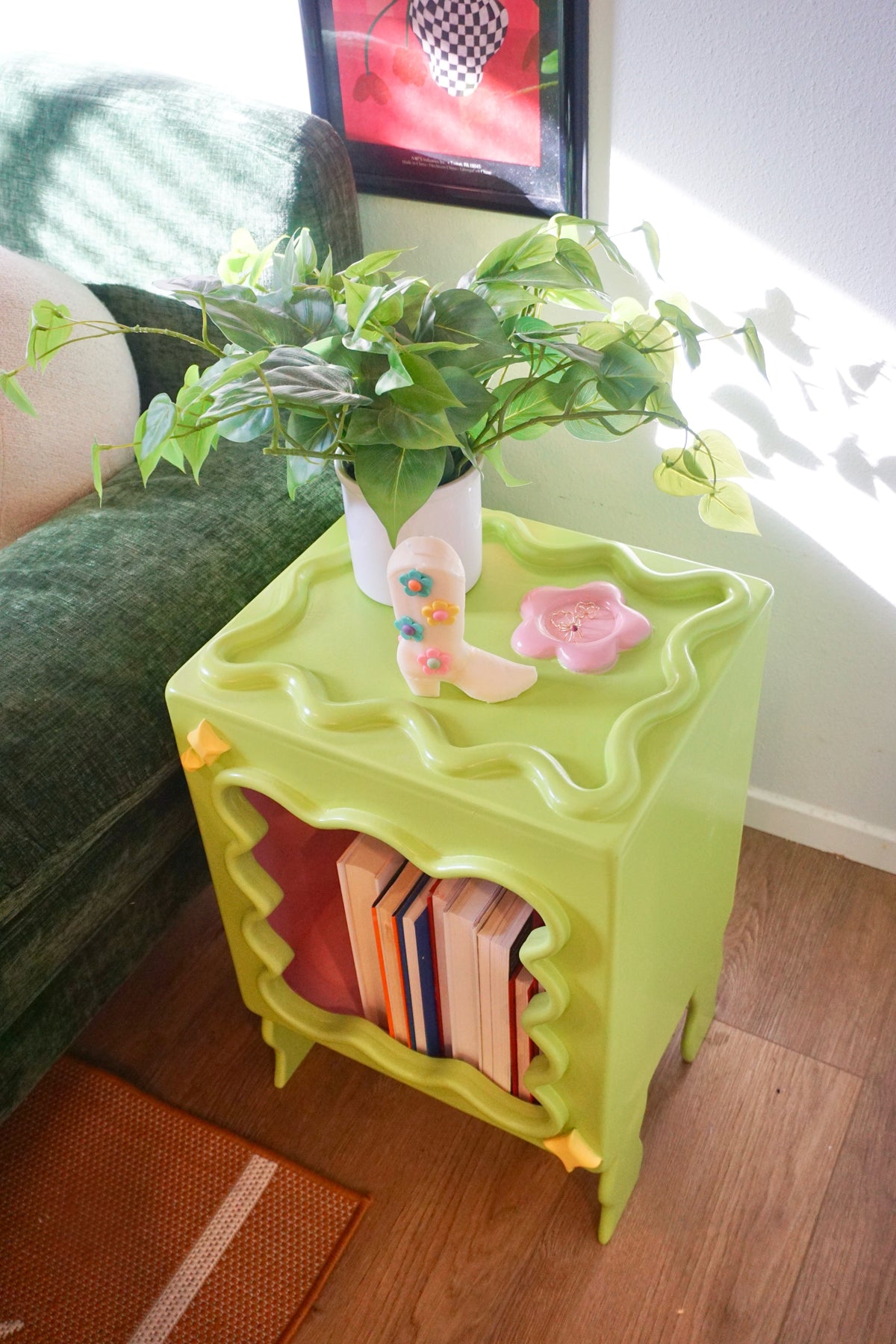Our most funky and functional side table to date. Crafted with an eye-catching wavy catch all tray and flowery built-in ring holder on top. Truly designed with your uniqueness in mind! The inside storage is the perfect spot to hold all of your favorite reads.