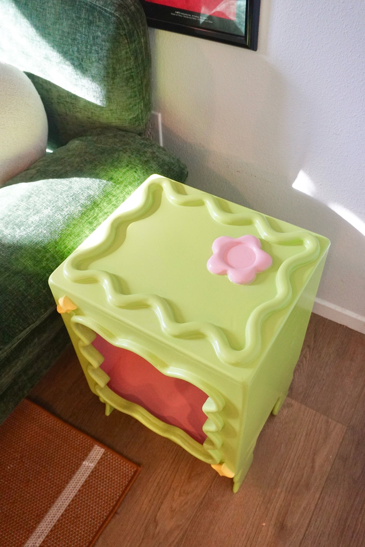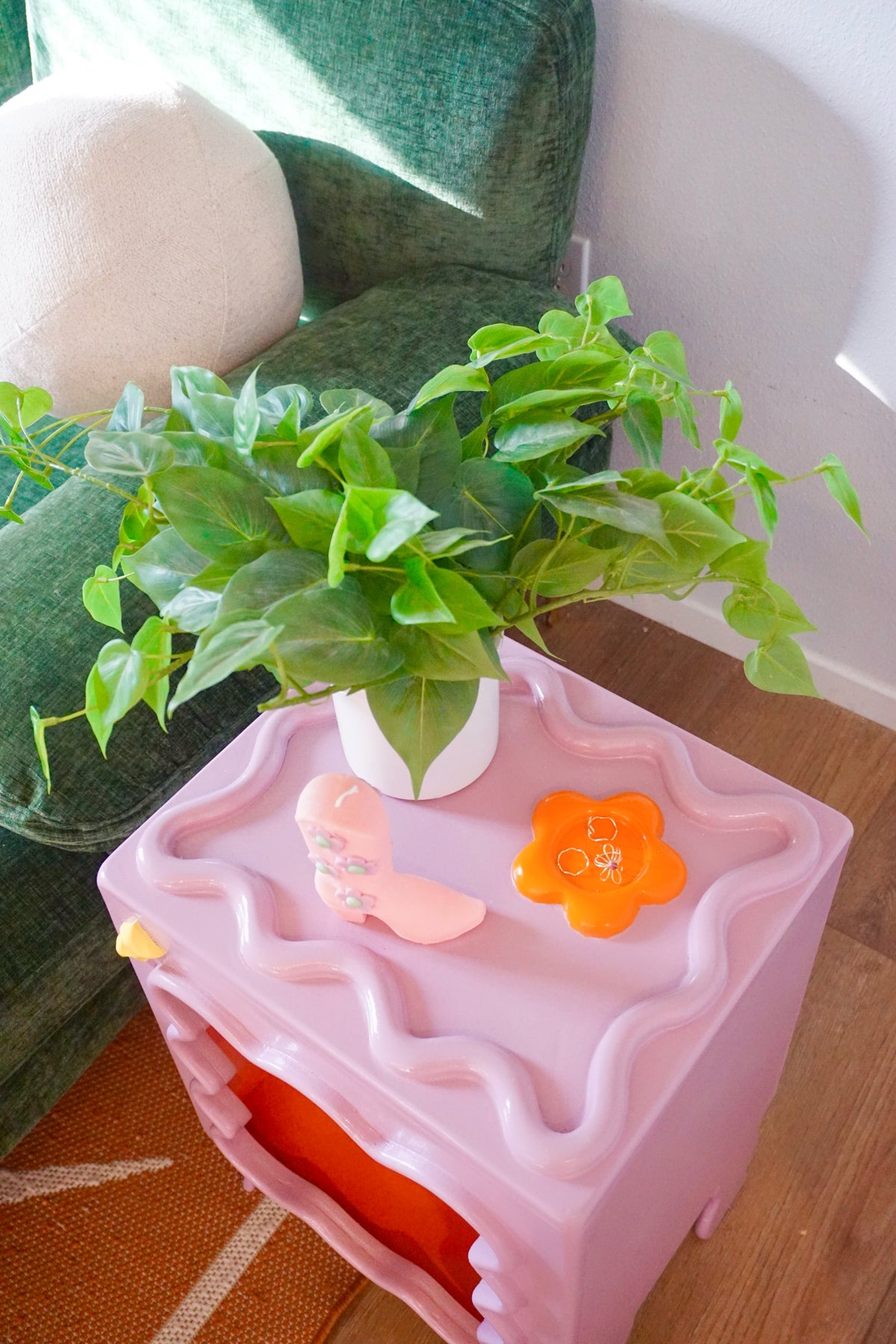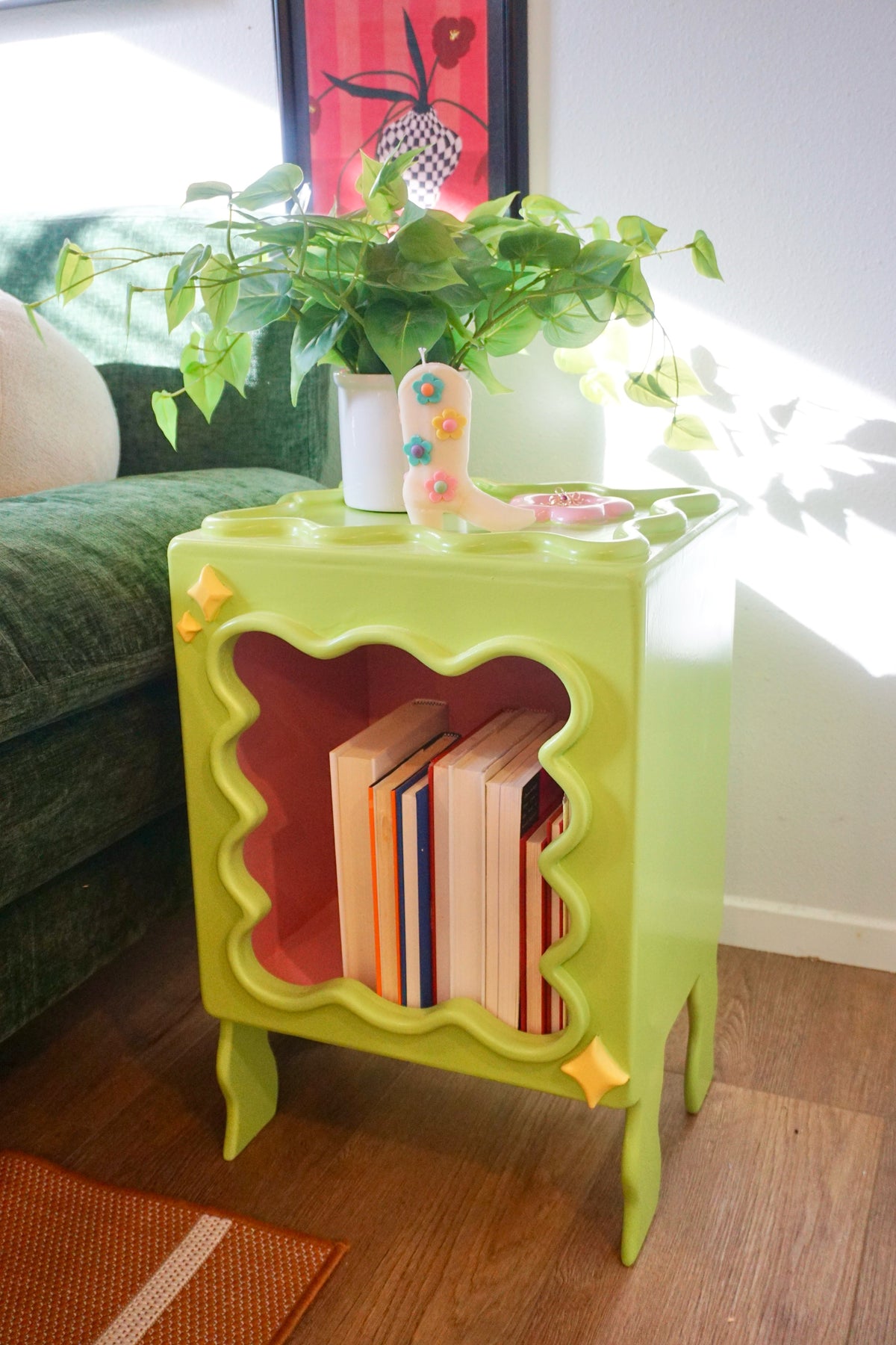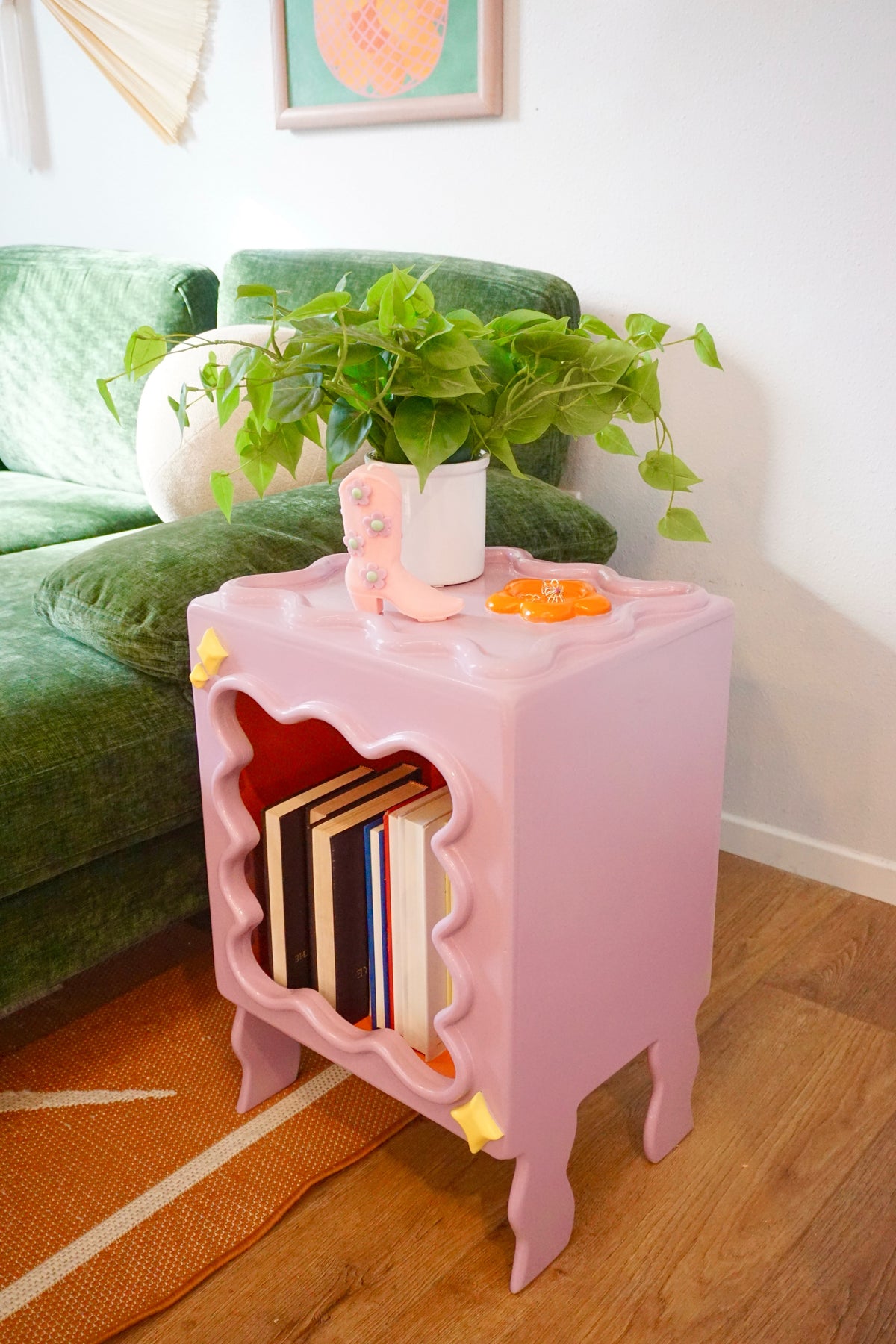 Our most funky and functional side table to date. Crafted with an eye-catching wavy catch all tray and flowery built-in ring holder on top. Truly designed with your uniqueness in mind! The inside storage is the perfect spot to hold all of your favorite reads.