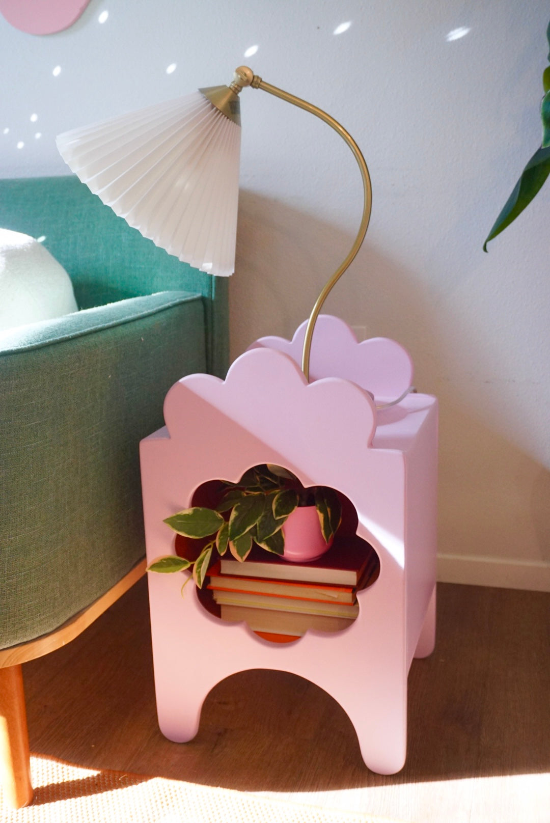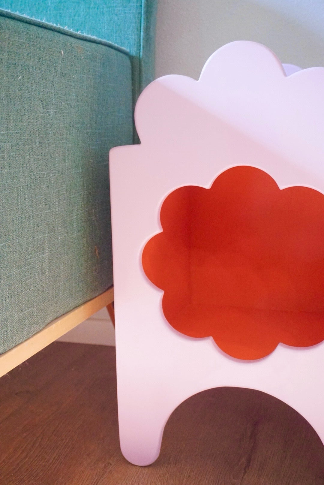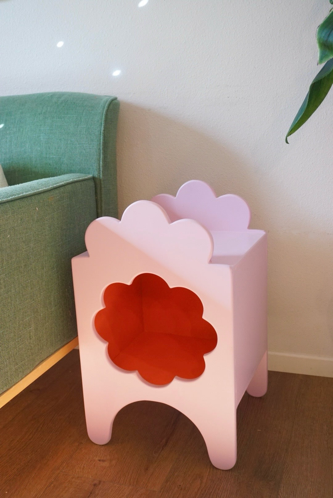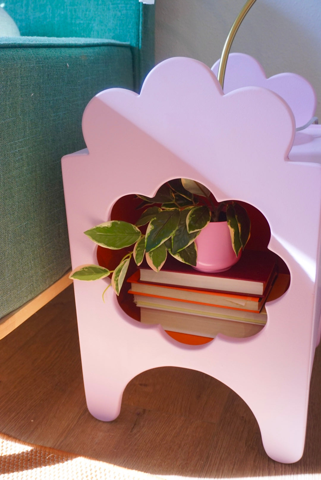 A whimsical addition to our side table collection, and yours too! Featuring a unique floral trim accent on top and cute matching cubby to store your favorite books, plants, ceramics and more. Complete with custom crafted curved legs. The table pictured displays a lilac exterior and lovely orange interior.