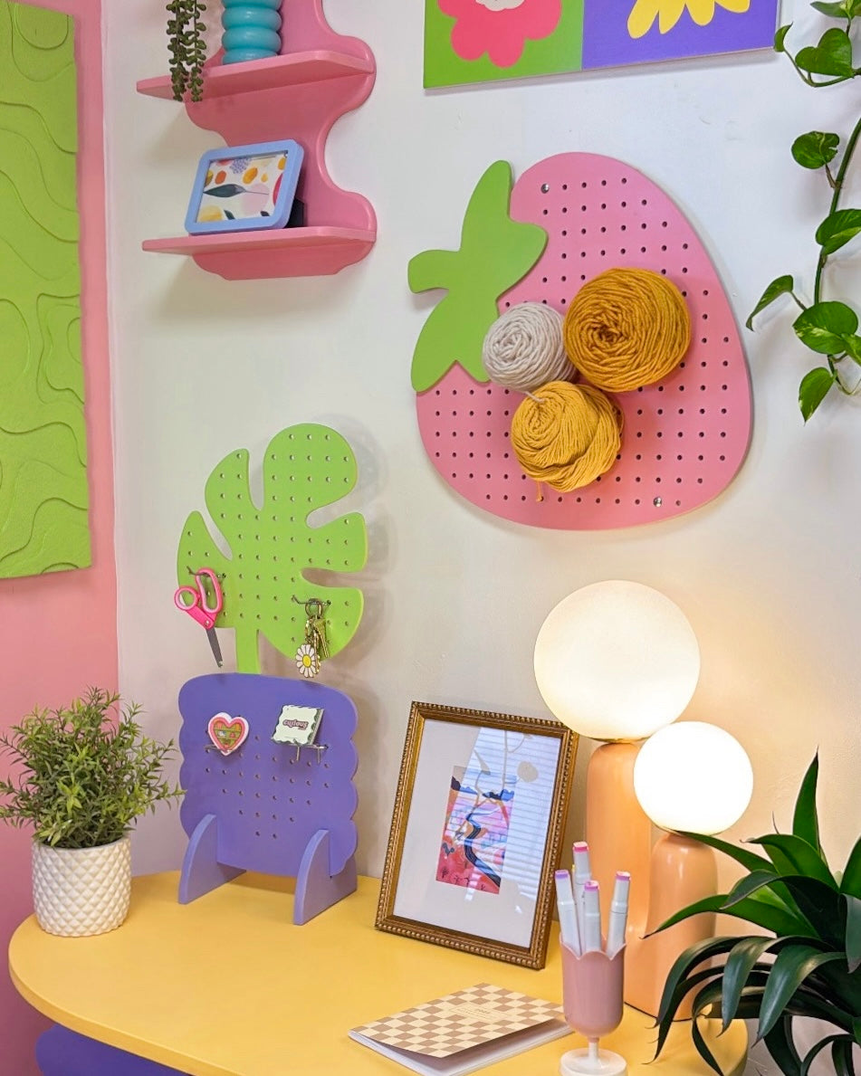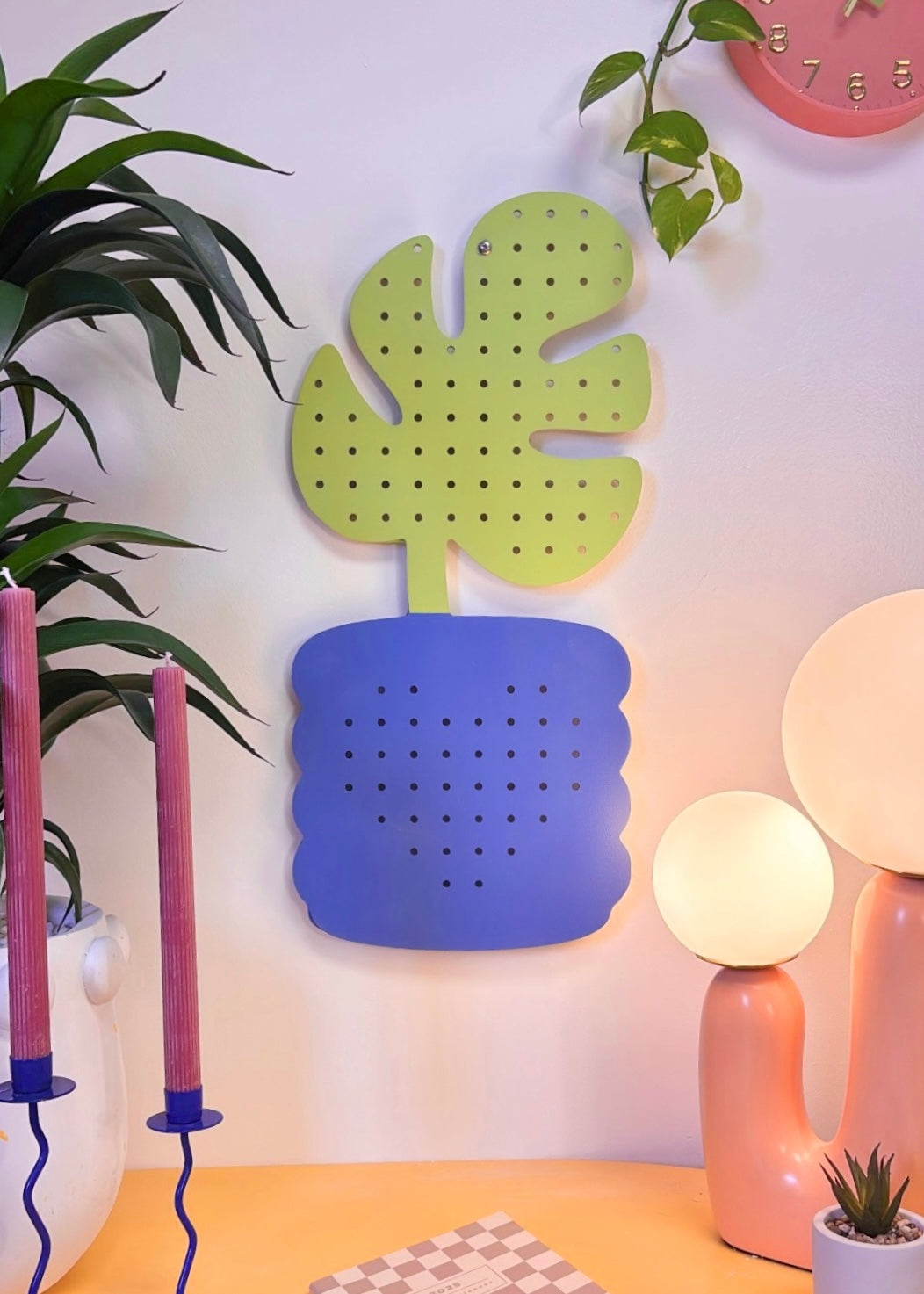 This pegboard is a whole vibe: a chunky monstera in a bubbly planter pot — with peg holes punched in the sweetest heart shape. For the plant girlies and leafy décor lovers, the Monstera is both playful wall art and functional storage. Hang trinkets, jewelry, or let her shine solo as your leafy bestie.