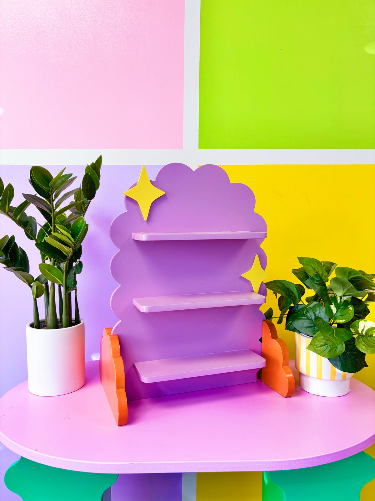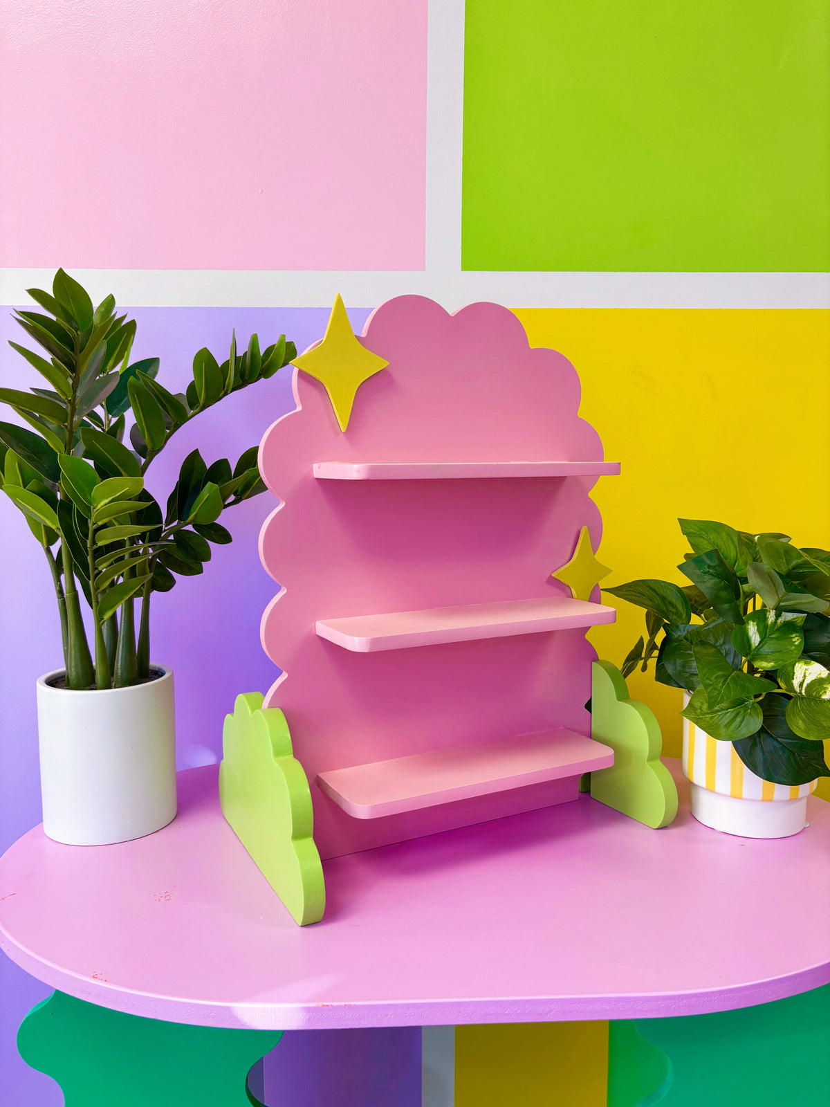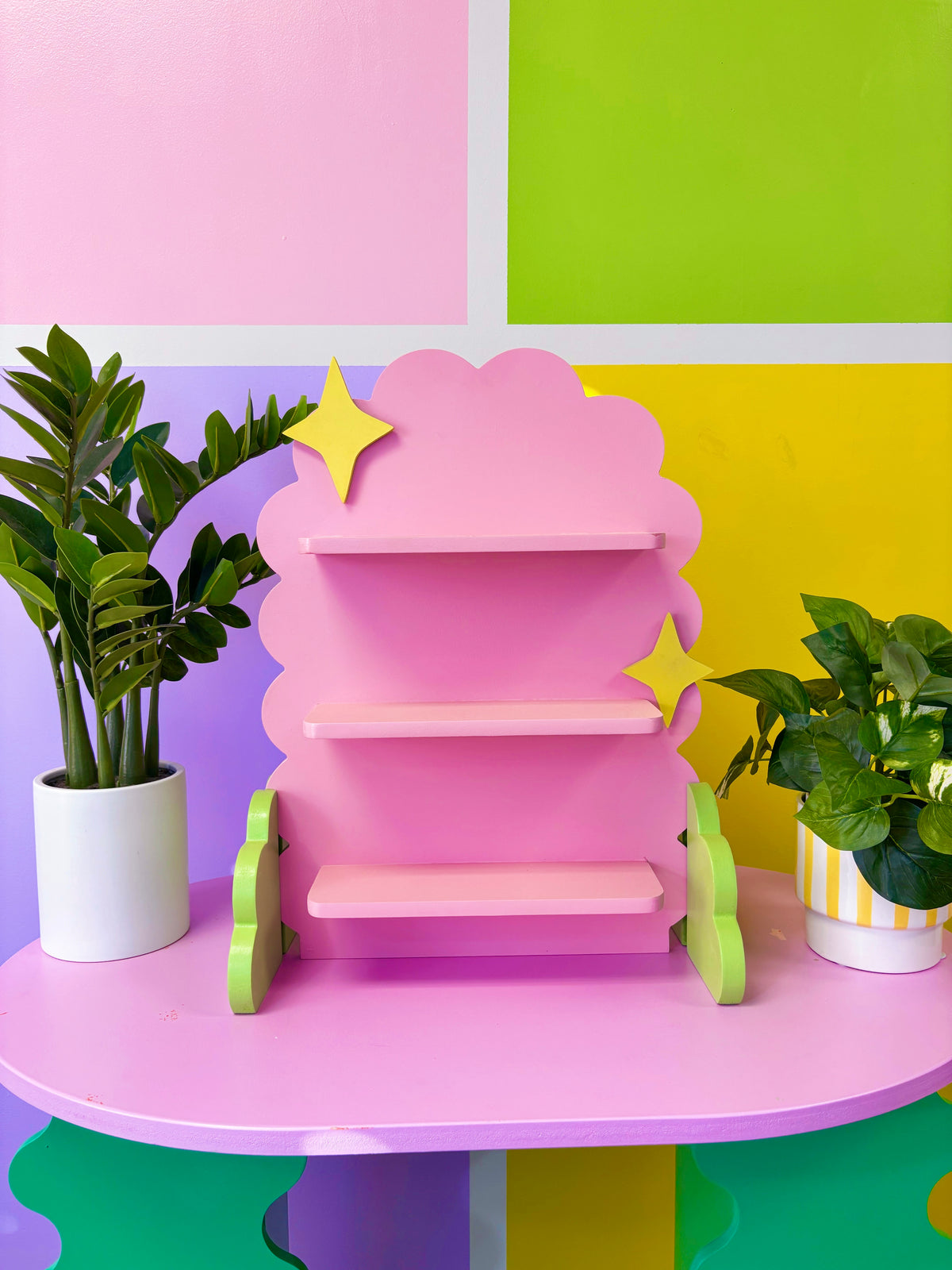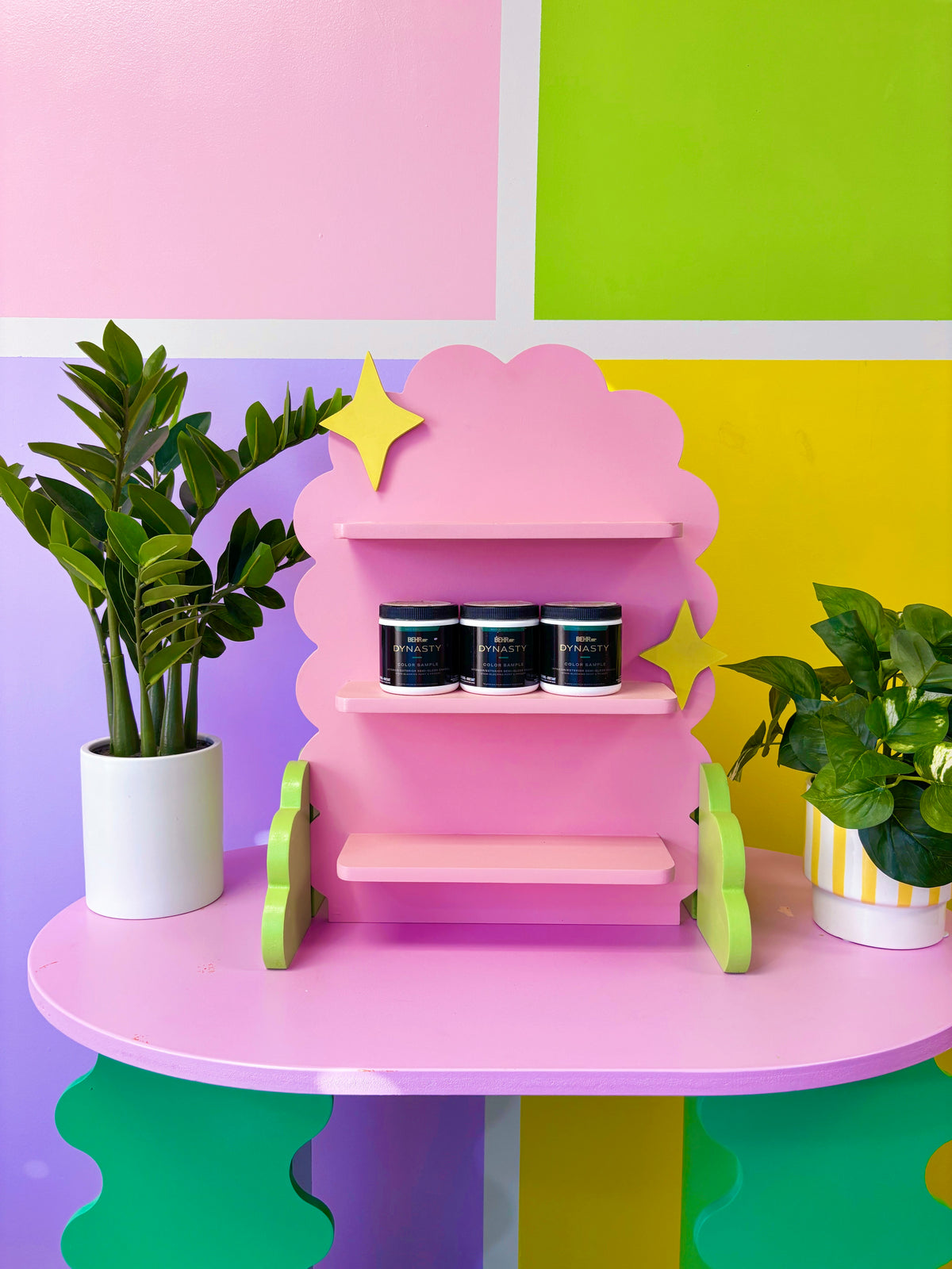 Elevate your decor with the Sofie Tabletop Display! Featuring a unique 3-tier shelf in a charming scallop design with legs made to match. Created especially for the trinket collectors and small business owners looking to add some sparkle to their display. ✨